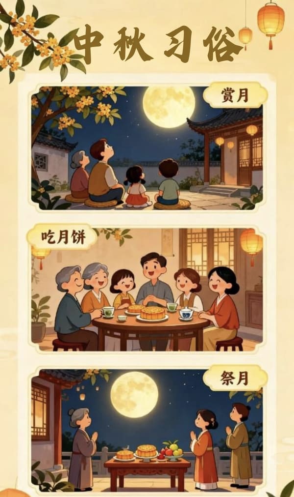 Ngắm trăng: Vào đêm Trung Thu, các gia đình cùng nhau ngồi ngoài sân, ban công hoặc công viên để thưởng trăng, uống trà và ăn bánh.