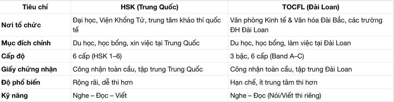 Bảng sau đây giúp bạn dễ dàng so sánh HSK và TOCFL về cấp độ, kỹ năng, ứng dụng và độ phổ biến.